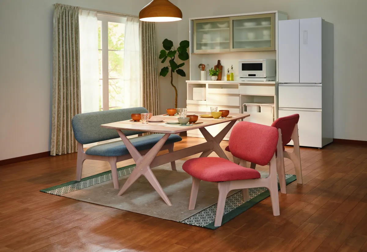 また、布生地も新しくリニューアルされており、触り心地がより柔らかくなったことも嬉しいポイント。さらに、座面のウレタン密度が向上し、座り心地が一層向上しています。食事だけでなく、お茶を楽しむ時間や家族の会話を楽しむ際にも、ゆったりとしたひとときを提供します。