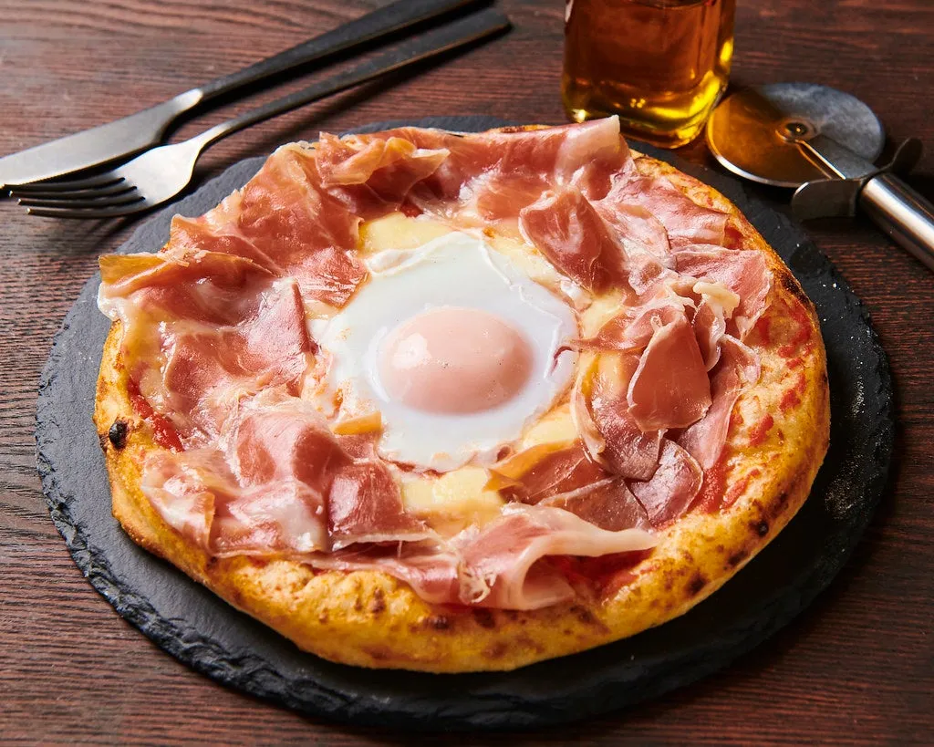 この美味しいピザは、トマトソースをベースにした生地にモッツァレラチーズと大寒卵、そして生ハムをトッピングして焼き上げた一品です。生地には香ばしい石臼挽き小麦が使用されており、豊かな麦の香りが楽しめます。カットすると流れ出る卵と生ハムが絶妙なハーモニーを生み出し、思わずもう一切れ食べたくなる味わいです。