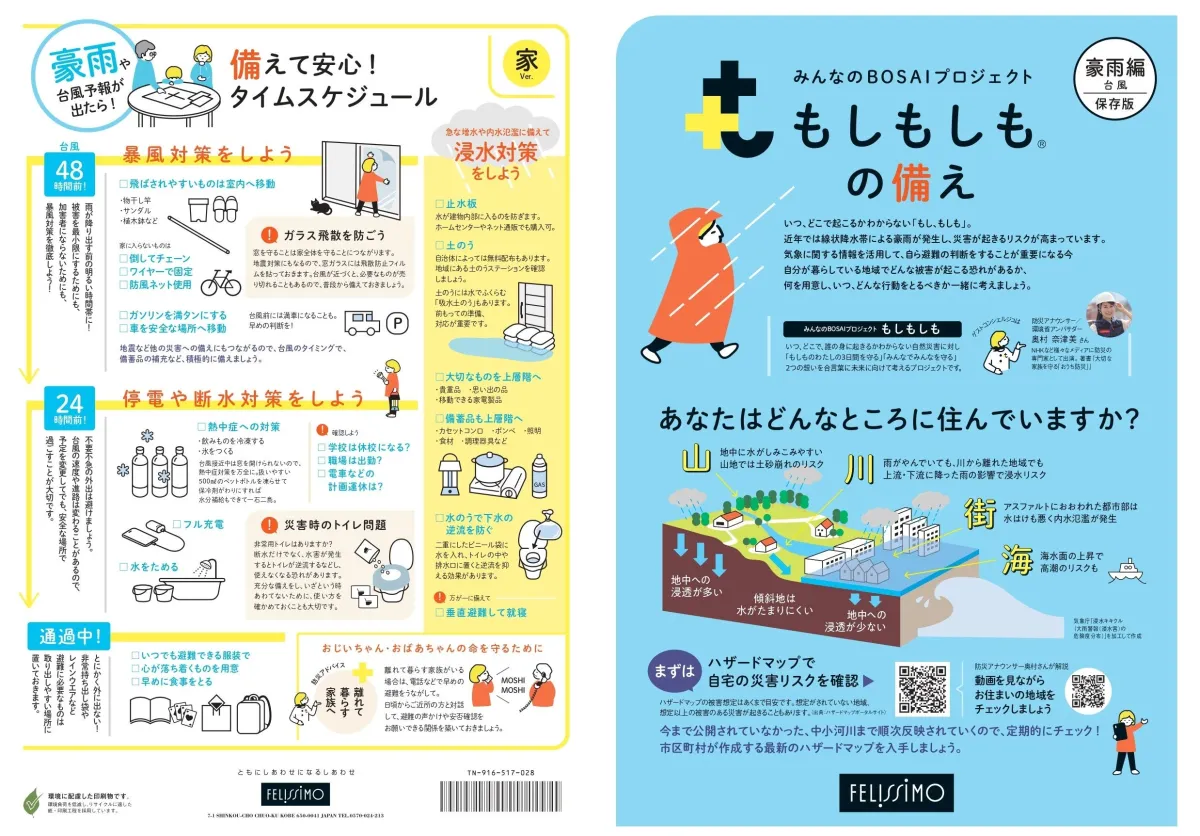 9月1日は防災の日。この日を前に、フェリシモの「みんなのBOSAIプロジェクト もしもしも®」が新しい「防災ガイド(豪雨・台風編)」を無料で配布することを発表しました。このガイドの配布は、自然災害が頻発する現代において、私たちがどれほど準備をすることが重要かを気づかせてくれる機会です。