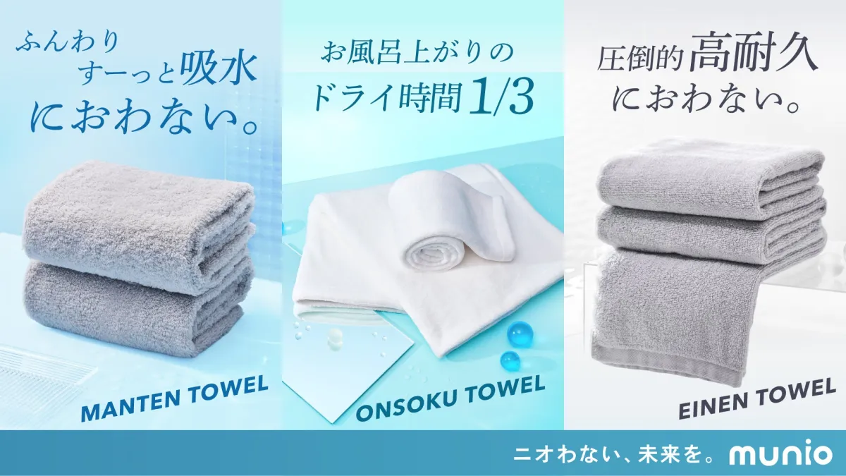 タオルはその使用頻度から、毎日の生活に欠かせないアイテムです。しかし、湿気や汗による匂いや、清潔さを保つことは意外と難しいもの。そんな悩みを解決するために誕生したのが、株式会社KURUKURUが新たに立ち上げたタオルブランド「MUNIO」です。今回は、MUNIOのタオルシリーズが持つ特徴や開発者の想いに迫ります。