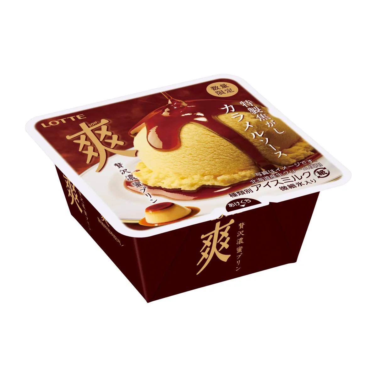 『爽贅沢濃蜜プリン』の大きな特徴は、北海道産生クリームを使用した贅沢なプリン風味のアイスです。このアイスには、特製の焦がしカラメルソースがふんだんに使われており、食べた瞬間にほろ苦さと甘さが広がります。しっかりした乳の風味を感じつつ、アイスミルク規格ならではのリッチな味わいが堪能でき、満足のいく食体験が演出されています。