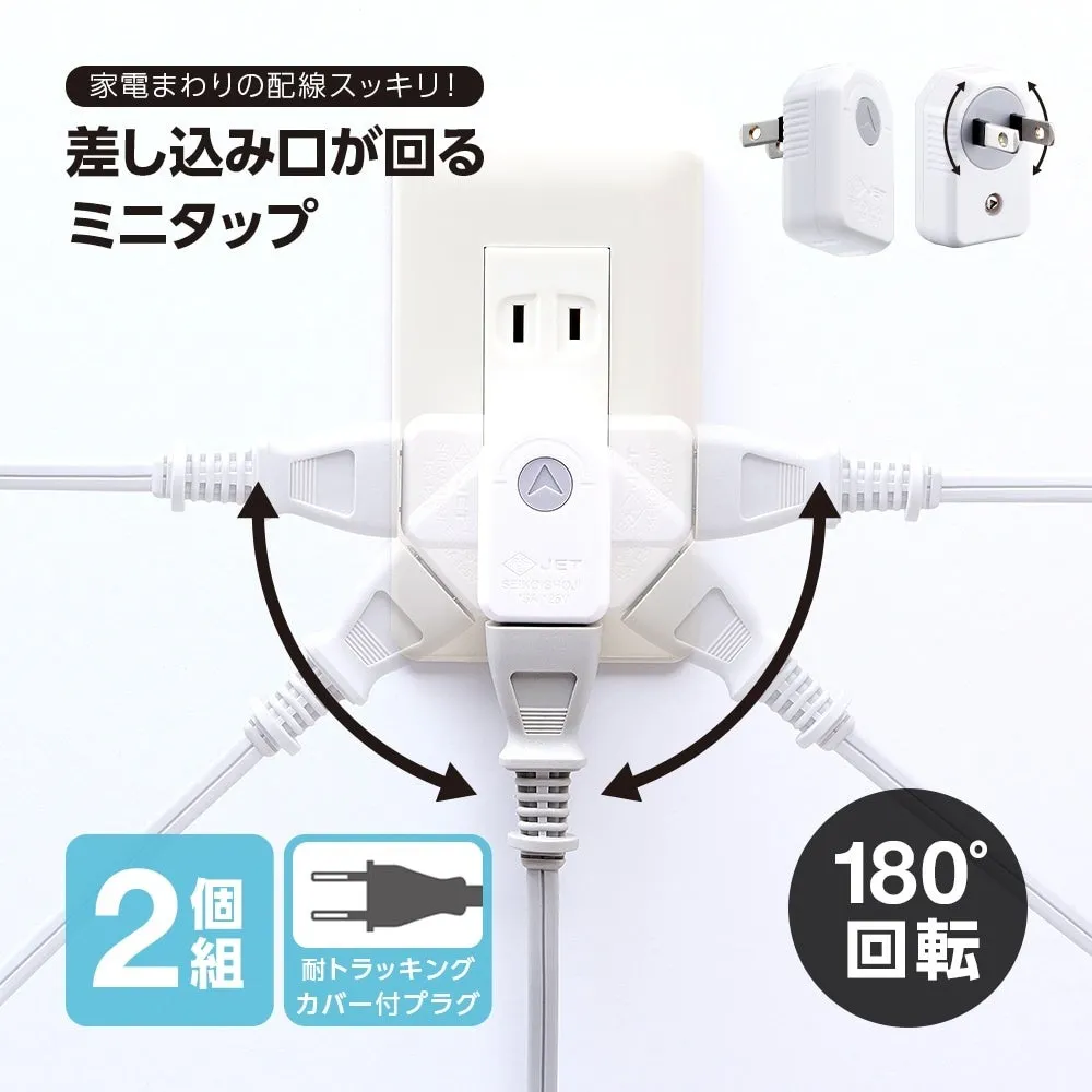 このミニタップは、狭いスペースでも活用できる設計が特徴です。差し込み口が左右に180°回転するため、家具の裏や隙間でも簡単に配線ができ、コンセント周りをスッキリと整理することができます。これまでのタップに比べ、使い勝手が飛躍的に向上しました。