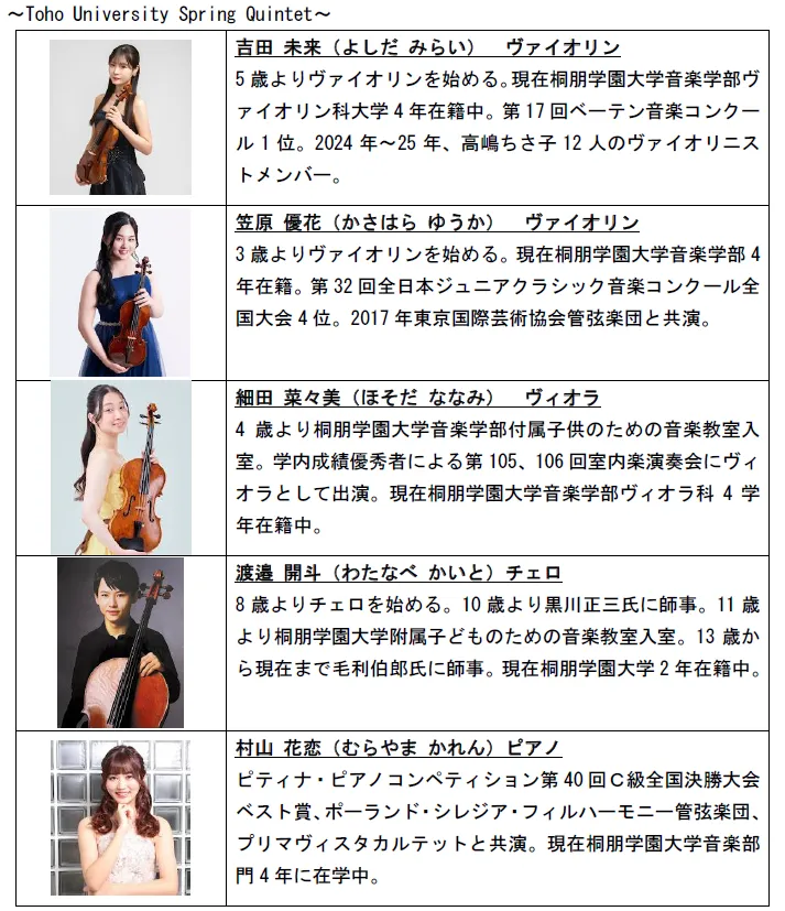 この日、ピアノ五重奏による演奏が行われます。演奏は、箱根の名物ともいえる高嶋ちさ子とのコラボレーションを経て、結成された「Toho University Spring Quintet」によるもの。彼らは、箱根の自然と調和した音楽を奏で、訪れる人々に感動を与えます。演奏は全4回、各約30分の予定です。