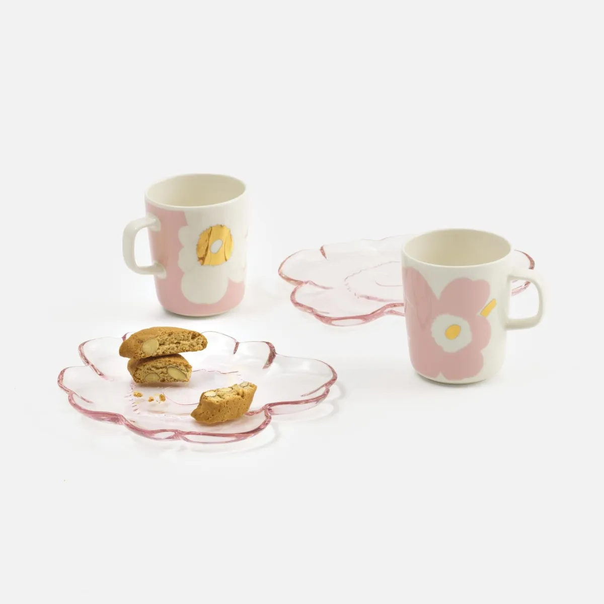 今回のコレクションは、マリメッコのシンボルともいえるウニッコのフラワープリントが、優しい桜のピンク色に染め上げられています。この柔らかな色合いは、春の訪れを感じさせ、どんな食卓にも温かな雰囲気をもたらします。さまざまなアイテムがそろっており、特に目を引くのは4dlのマグカップや20cmのプレート、さらにはウニッコをモチーフにしたガラスプレートとスモールボウルセットなどです。