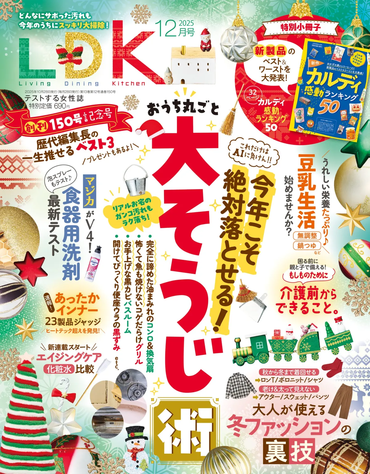 2025年12月号のLDKは、創刊150号を記念し、心躍る特集が盛りだくさん。この号では、生活を楽しむための情報が満載です。特に注目すべきは「ラク落ち大掃除術」や歴代編集長による特別企画、「冬ファッション裏技ガイド」です。