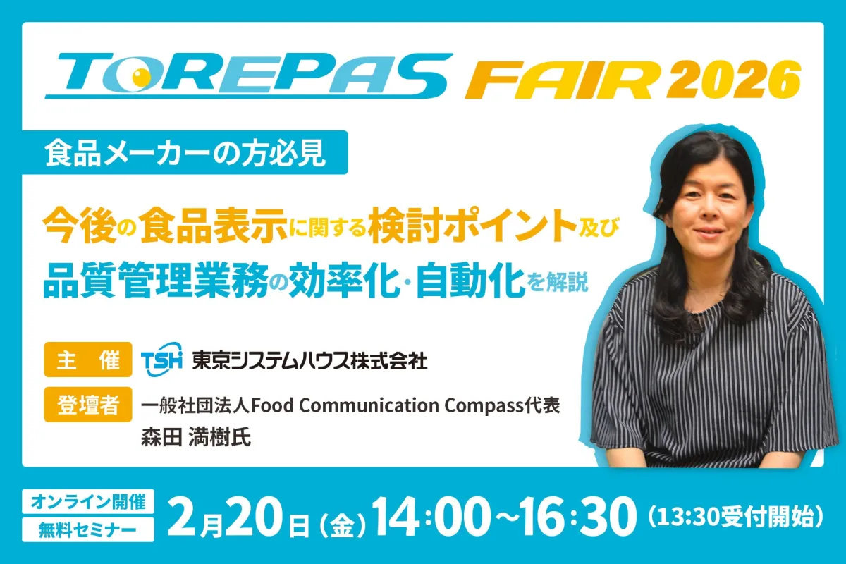 2026年2月20日(金)に、東京システムハウス株式会社が主催する食品メーカー向けのオンラインセミナーが開催されます。このセミナーでは、食品表示制度の現状や品質管理業務の効率化、そして自動化に関する様々な情報が提供されます。今回は講師として一般社団法人Food Communication Compassの代表である森田満樹氏を迎え、食品表示における新たな検討ポイントを解説していただきます。