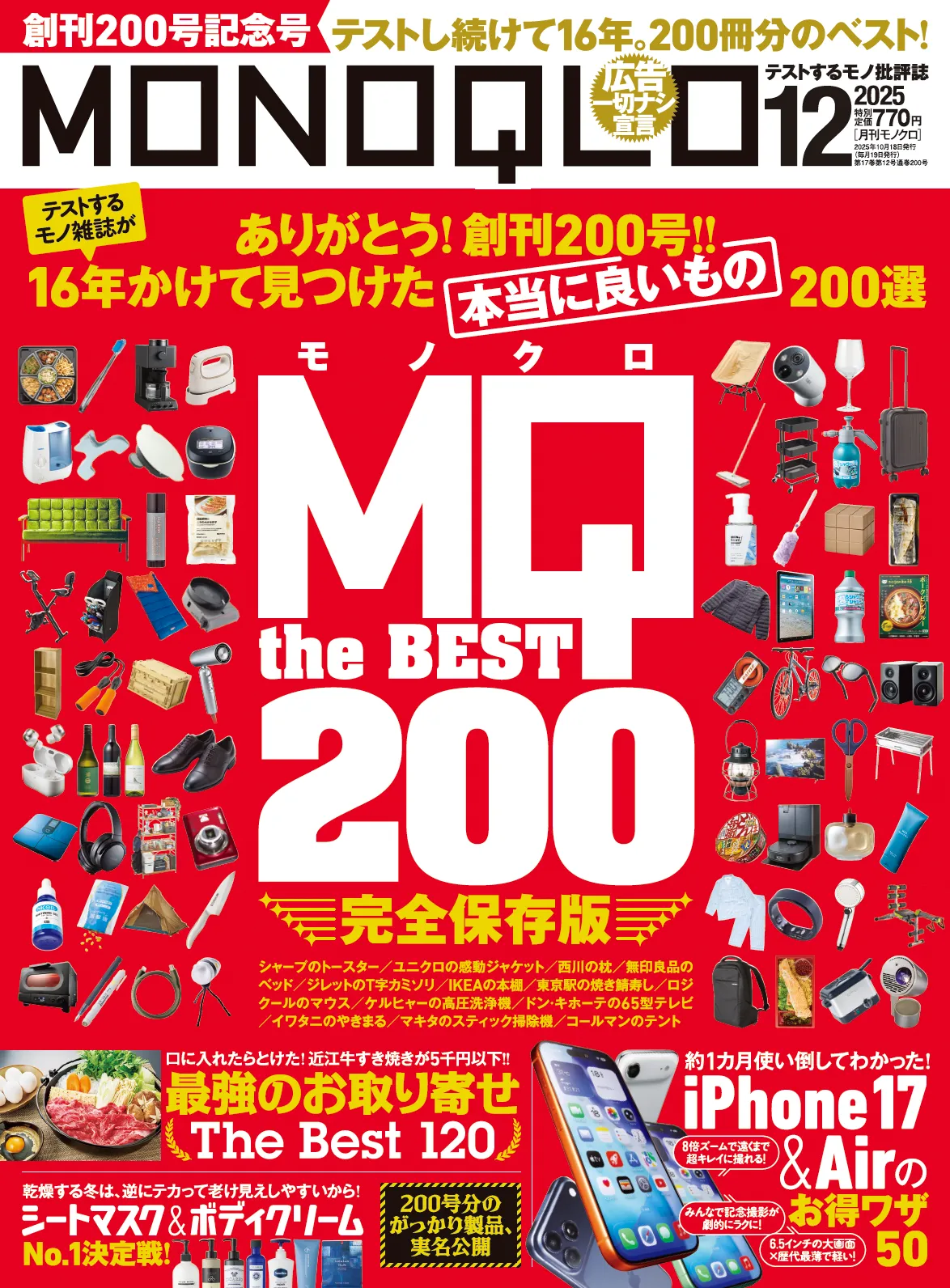 月刊誌『MONOQLO』がこの度、創刊200号を迎えました。16年間にわたり、多くの製品を徹底的にテストし続けた結果、今回特集として「本当に良いモノ200選」を厳選してご紹介します。これまで本誌をご愛読いただいた読者の皆様に感謝の気持ちを込め、おすすめのアイテムを一挙に集めました。