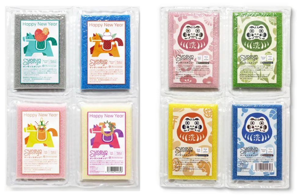 新商品の他に、同時に発売される「だるまサンサンスポンジ」も大注目です。このアイテムは、四色展開でそれぞれ異なる願いを込めています。