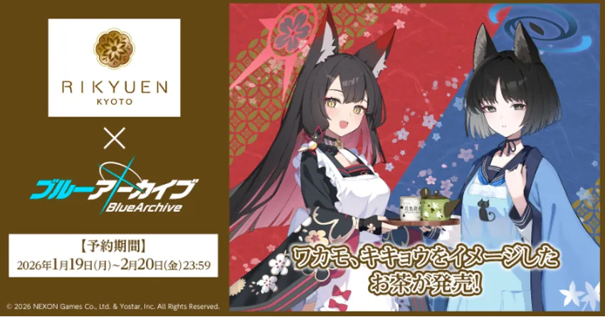 2026年1月19日から、女性に大人気のスマートフォン向けアプリゲーム『ブルーアーカイブ -Blue Archive-』と、京都の伝統あるお茶専門店、京都利休園との夢のコラボ商品が販売されることが発表されました。この特別な商品は、『ブルーアーカイブ』のキャラクター「ワカモ」と「キキョウ」をイメージしたオリジナルブレンド茶のセットです。ご予約は2026年2月20日まで可能で、限定商品のため残り期間も少なくなっています。