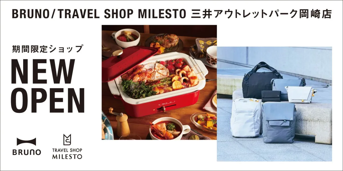 三井アウトレットパーク岡崎に、新しい楽しみ方を提供する複合ブランドショップ「BRUNO / TRAVEL SHOP MILESTO」が登場します。このショップは、魅力的なライフスタイルを提案する「BRUNO」と、日常を旅のように楽しむ「MILESTO」が一体となった特別な空間です。