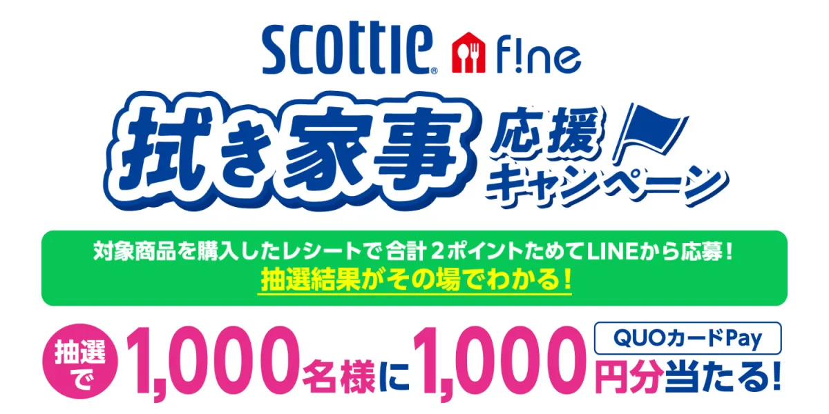 日本製紙グループの日本製紙クレシア株式会社が、スコッティのキッチン商品ブランド「スコッティ ファイン」において、「拭き家事応援キャンペーン」を実施します。このキャンペーンは2025年12月1日から2026年2月28日までの期間限定で、対象商品を購入したレシートを活用して抽選でQUOカードPay1,000円分をゲットできるチャンスです!