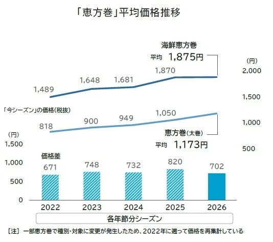 今年も節分の季節が近づいてきましたが、2026年の恵方巻の価格は例年に比べて大きな変動を見せています。特に、日本の各流通業者は厳しい物価高に直面しており、その影響が恵方巻の価格に反映されています。データによれば、一般的な五目・七目の恵方巻は1173円と、前年に比べて11.7%の値上がりを記録しました。これは2年連続の上昇で、金額ベースでは最も大きな引き上げ幅となります。