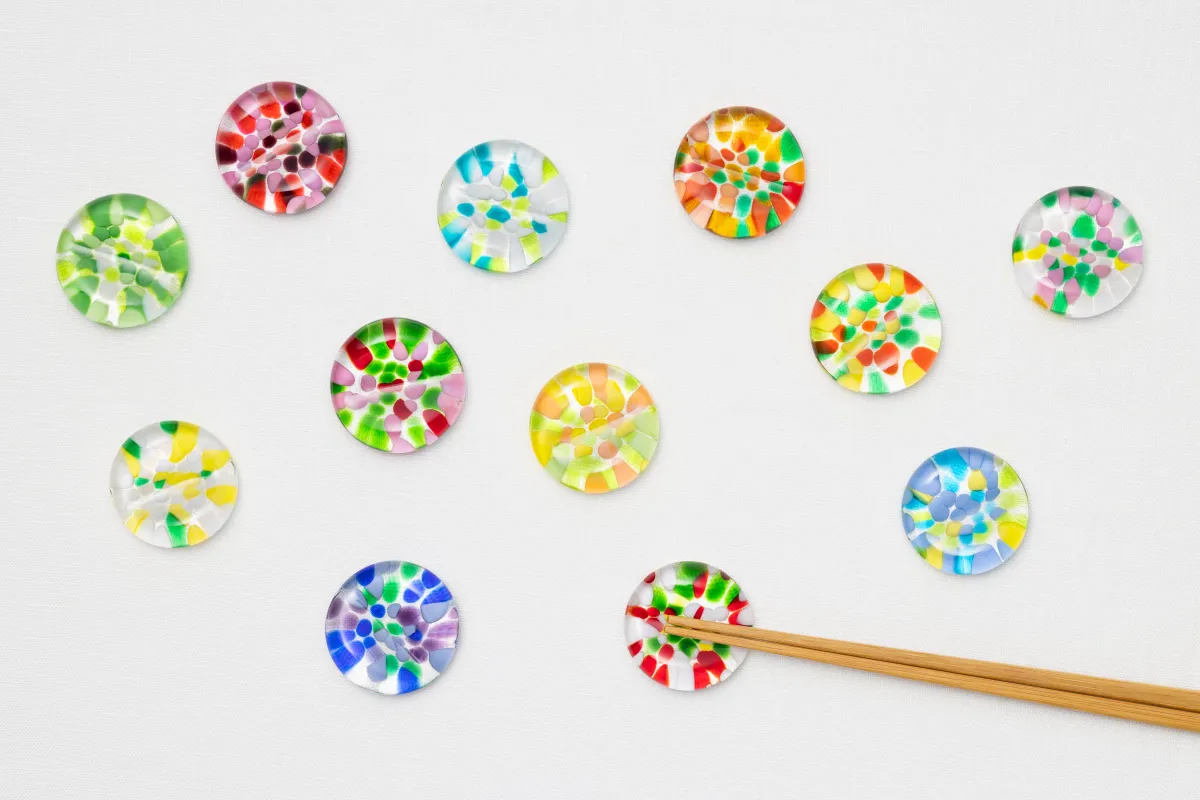 この箸置きは、女性職人の手により一つ一つ丁寧に作られており、色の重なりや季節感を感じさせる風合いが魅力です。同じものはひとつもなく、まさしく“自分だけの花”として味わえる個性が表現されています。光の当たり方や角度によって変わる色合いは、見る人を引きつけるような美しさです。