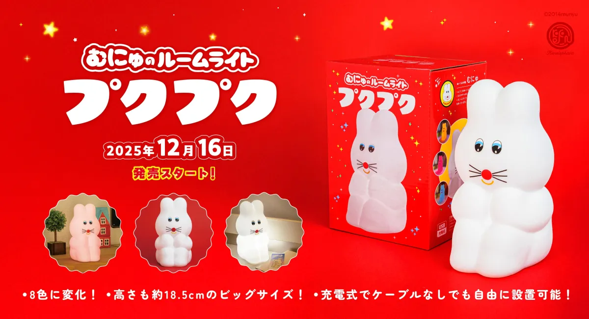 ぬいぐるみやキャラクター商品で知られるアート雑貨メーカー、株式会社ケンエレファントが新たに発表した『むにゅのルームライト プクプク』。2025年12月16日(火)に発売予定のこのアイテムは、人気のぬいぐるみ作家むにゅさんとのコラボレーションによる、同社初のルームライトです。