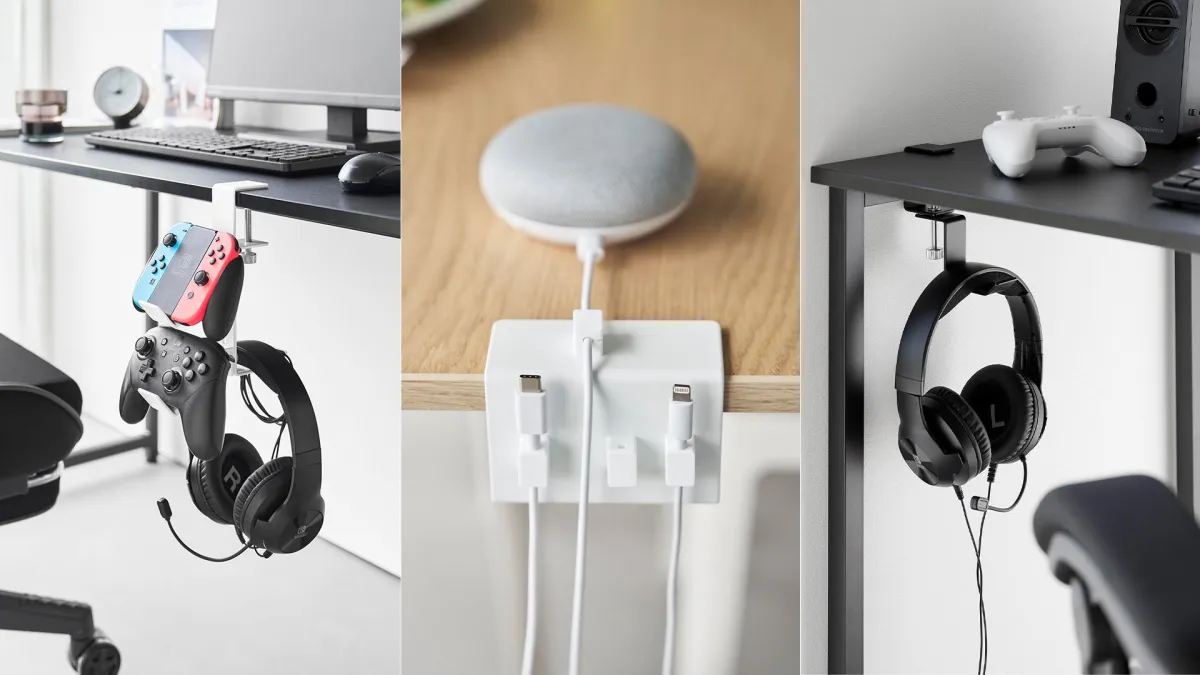 このラックはクランプ式でしっかりとデスクに固定でき、安定感は抜群。さらに、コントローラーのサイズに応じて高さ調節が可能で、収納物が安定して収まるよう設計されています。嬉しい滑り止めクッションが付いているため、収納物にキズがつく心配も不要です。また、マグネット内蔵のケーブルホルダーが付属しているため、ヘッドホンジャックや充電ケーブルもすっきりとまとめて収納できます。