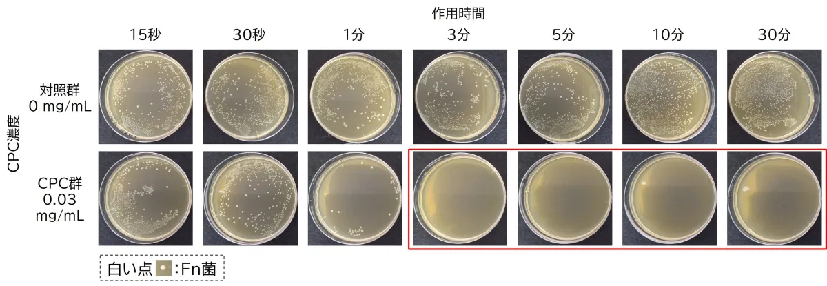 口臭対策として注目したい成分がCPC(セチルピリジニウム塩化物水和物)です。CPCは細菌の細胞膜を攻撃し、効果的に口臭原因菌を殺菌することができます。具体的な実験により、CPCを含む水溶液がFn菌を短時間で減少させることが視覚的にも確認されました。対照群と比較して、CPCの効果は非常に顕著であり、3分間でほぼ菌が検出されない状態に達しました。