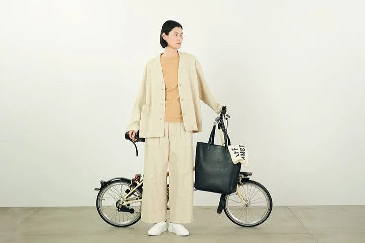 ほかのアイテムに目を向けると、レーヨンシルクの混紡糸を使用したスラブネップツイード生地のセットアップが登場します。このセットアップは、軽やかに体にフィットし、シワになりにくい特性を持ちながら、日常使いにも理想的です。特にパンツやノーカラージャケットはスタイリングが楽しめるアイテムとしておすすめです。
