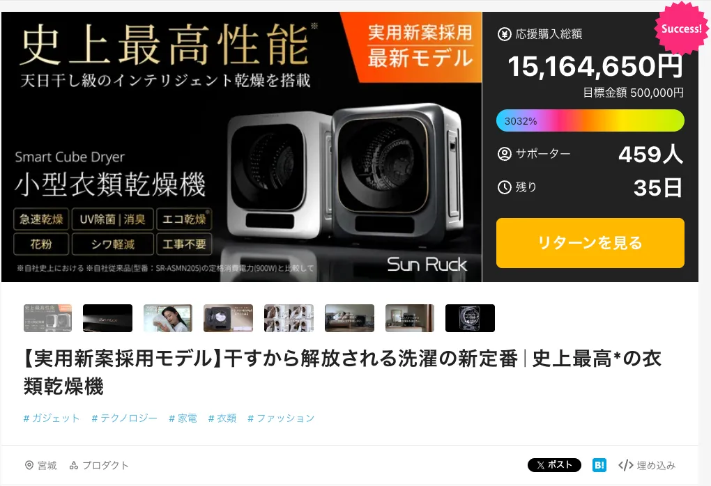実際、Smart Cube Dryerは先行予約販売でスタートからわずか12時間で1,200万円以上の支持を獲得し、Makuakeのランキングでも1位を獲得しました。この反響は、需要の高さを裏付けるものと言えるでしょう。特に、時短と省スペースを追求するニーズに応える商品として注目を浴びています。