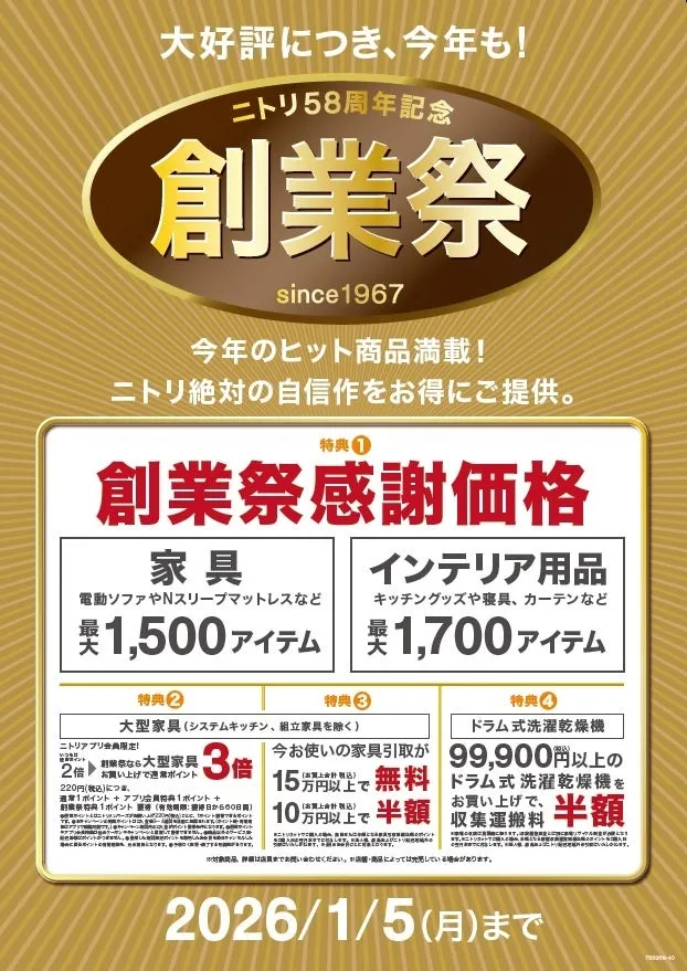 全国で「ニトリ58周年記念創業祭」を開催します。 dateの2025年11月28日から2026年1月5日までの約1ヶ月間、