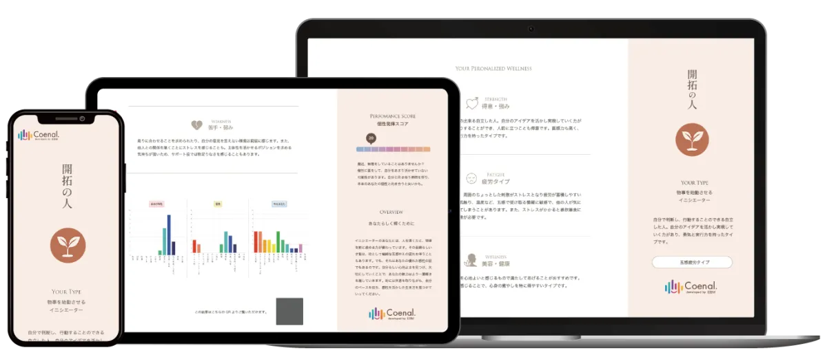 「コエナル」は、物理学者との共同開発によって生まれた診断ツールで、声から様々な情報を読み取ります。声帯の振動は身体や心の状態に密接に関連しており、その特性を解析することで、自分自身の気づかない強みや傾向を明らかにすることが可能です。特に、個性や疲労タイプに基づいて、最適な美容法や健康法を提案する点が大きな特徴です。