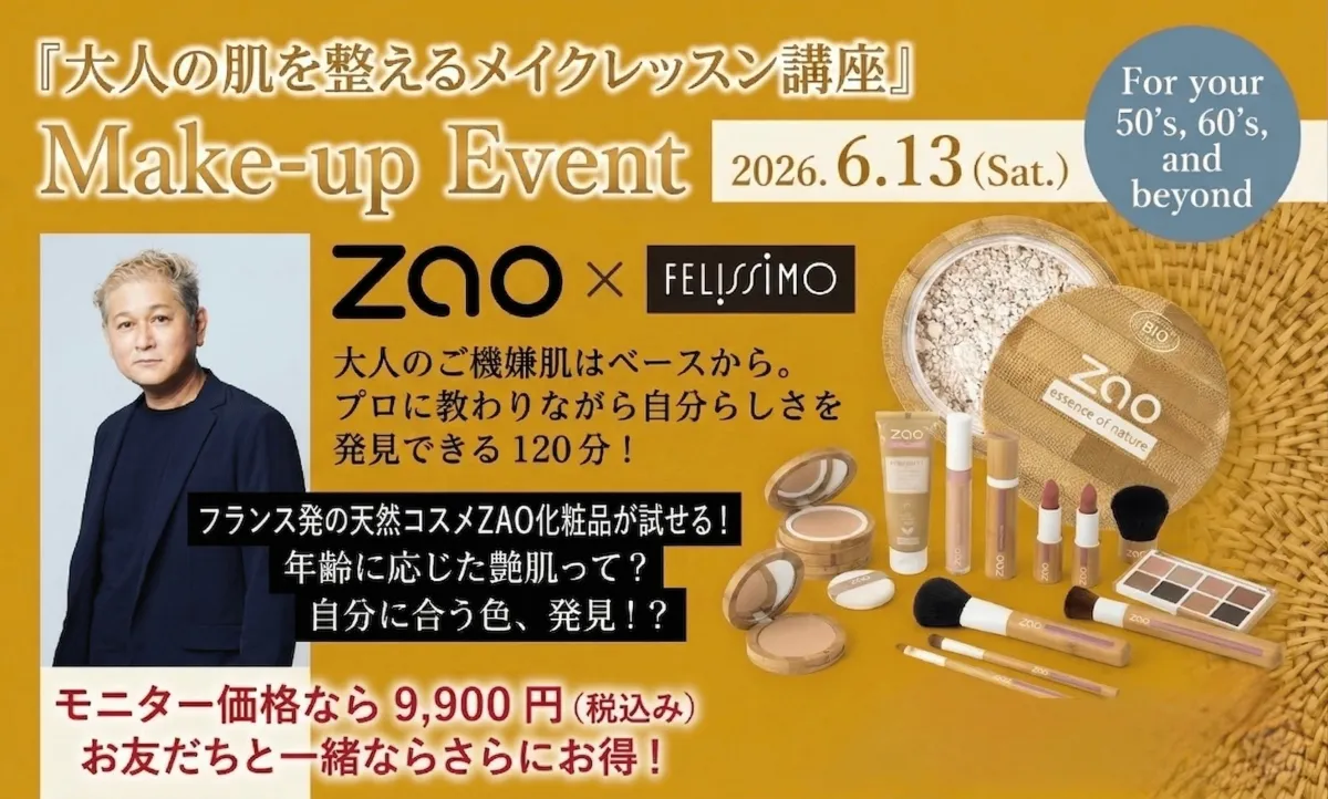 美しさは年齢と共に深化していくもの。そんなテーマを掲げているフェリシモが、フランスの天然コスメブランド「ZAO」の発売を記念した特別なメイクレッスンを開催します。2026年6月13日(土)、神戸の美しい海を背景にしたフェリシモ本社にて、プロのヘアメイクアーティストの中村有佑氏を講師に迎え、スキルアップを目指すチャンスです。
