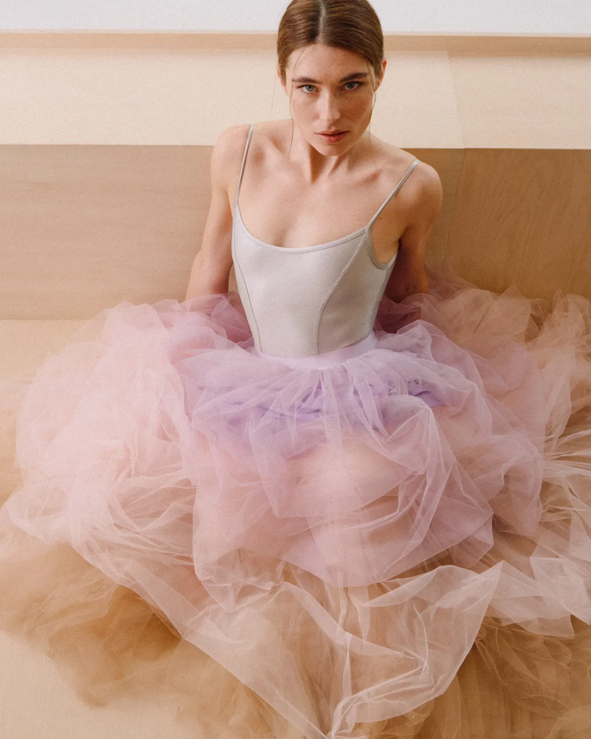 チュチュスカートの組み合わせで構成されています。このタイムレスなデザインは、柔らかなラインと絶妙なバランスを生み出し、まさにバレエを思わせる優雅さがあります。