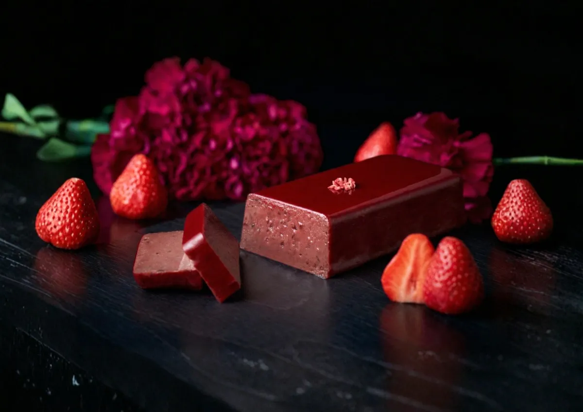 ストロベリーテリーヌは、甘酸っぱいいちごのフレーバーが濃厚なショコラと見事に調和した一品です。ベリー由来の美しい赤色のグラサージュが目を引き、見た目にも華やかさを演出しています。特にオーガニックチアシードを使った「つぶつぶ感」が独特で、大きな魅力となっています。これは、いちごの自然な甘さを引き立てるために考えられた工夫です。