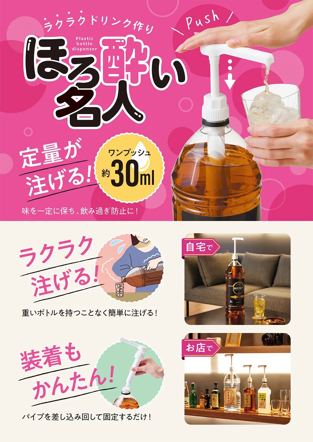 「ほろ酔い名人」は、約30mlをワンプッシュで注げる便利なディスペンサーです。設計は非常にシンプルで、貴重な時間を無駄にすることもありません。特に、友人や家族と集まった際にも大活躍。みんなが飲みたい分だけを、手間なく注げるので、パーティーやお祝いの場でも活躍すること間違いなしです。
