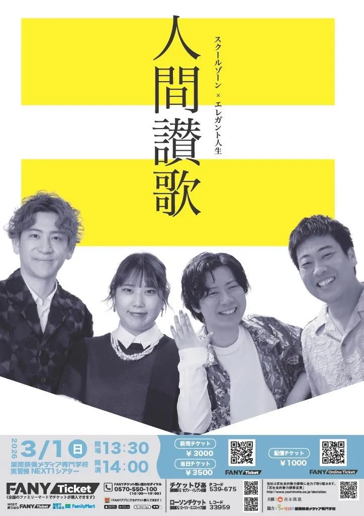 2026年3月1日(日)、新潟市の「i-MEDIA NEXT1シアター」にて、人気お笑い芸人が集結するライブイベント「スクールゾーン×エレガント人生 人間讃歌」が開催されます。このイベントでは、国際映像メディア専門学校に通う在校生たちが、現場スタッフとして運営をサポートします。この取り組みは、実際のエンターテインメント業界で求められるスキルを学ぶための貴重な機会となっています。