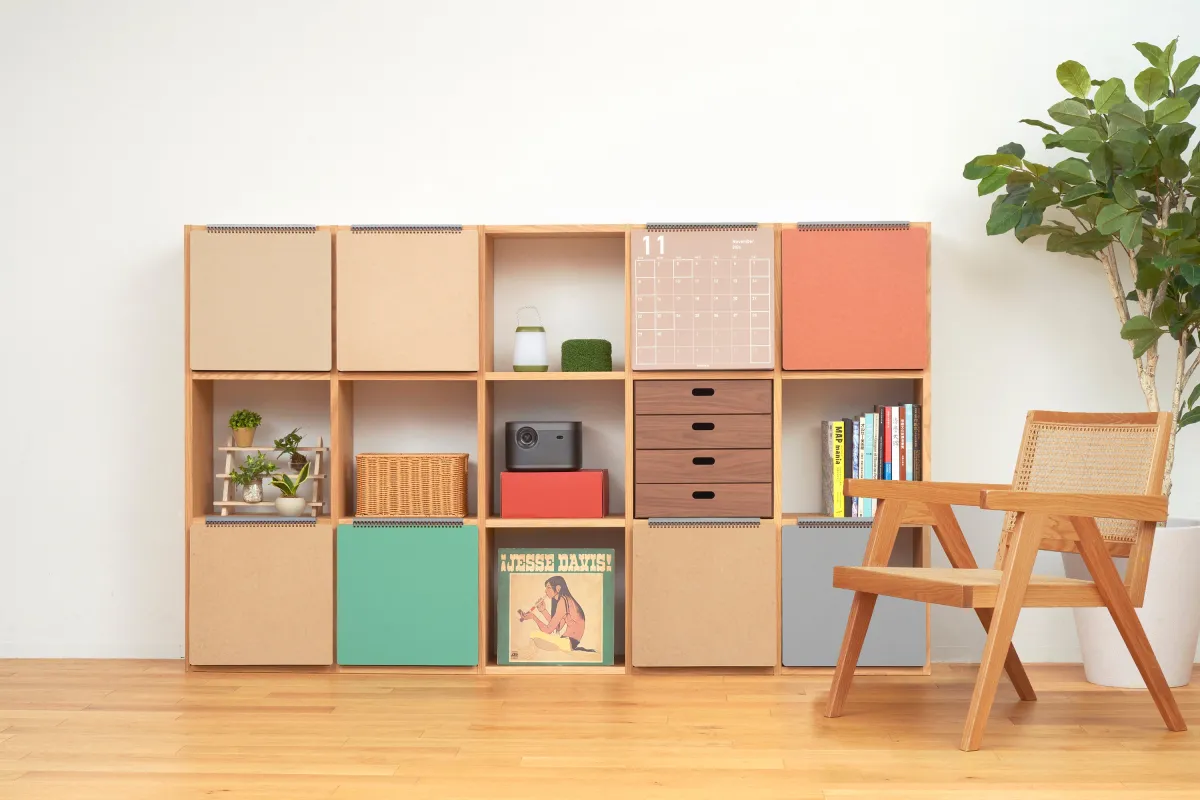「NORENTo」は、リング製本冊子とマグネット構造を利用した新感覚ののれんです。カラーボックスやシェルフのサイズに合わせて作られており、使いたい場所に簡単に取り付けできます。これにより、収納空間に潜む生活感を隠しつつも、インテリアとして魅力的に飾ることができます。「見せたくない」と思っていた部分を「見せたくなる」空間に変えてしまうのです。