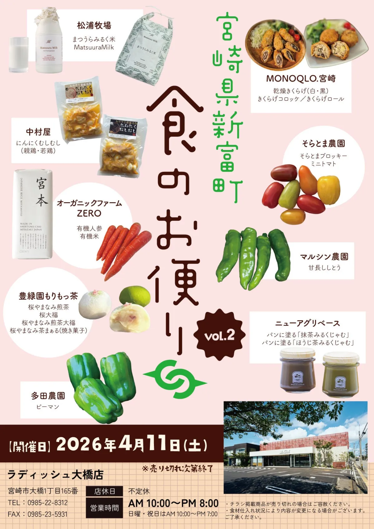 2026年4月11日(土)、宮崎県宮崎市のLa Dish 大橋店にて、一日限りの特別イベント「宮崎県・新富町 食のお便りvol.2」が開催されます。このイベントは、地域の生産者が集まり、新鮮な食材や手作りの惣菜、焼きたてのパン、精肉、ワインなどを直売する機会を提供するものです。前回の開催に続き、多くの方々に楽しんでもらえることを願っています。