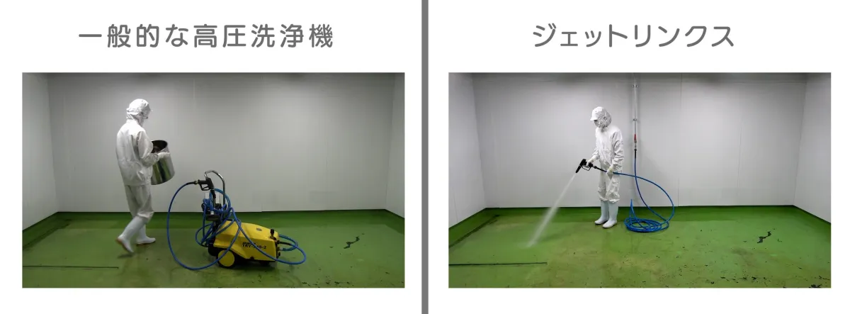 「ジェットリンクス」は、洗浄に伴う準備や片付けの手間をなくしました。従来は洗浄機本体やタンクを現場に設置する必要があったため、作業スペースが徐々に cluttered になりがちでした。しかし、この新システムでは、本体と洗浄現場は配管で接続され、必要な時にすぐに作業が始められます。