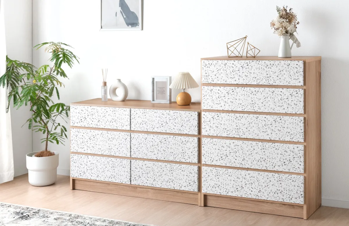 2023年、タンスのゲンからナチュラルモダンなデザインの家具シリーズ「テラファニ」が登場しました。このシリーズは、イタリアの伝統的な建材「テラゾー」に日本の木目を組み合わせた新しいスタイルです。家具としての日常使いができるだけでなく、部屋のコーディネートのアクセントにもぴったりです。