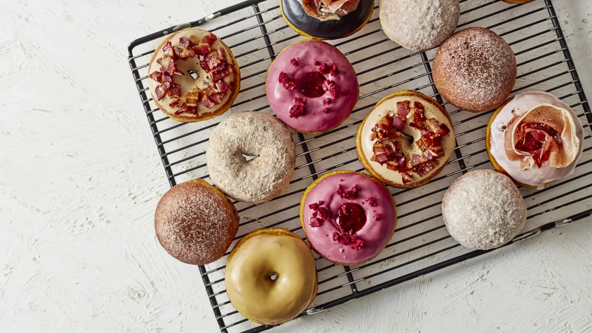 - リングドーナツ:和三盆グレーズ、トリプルラズベリー、スパイスチャイ、メープルベーコン