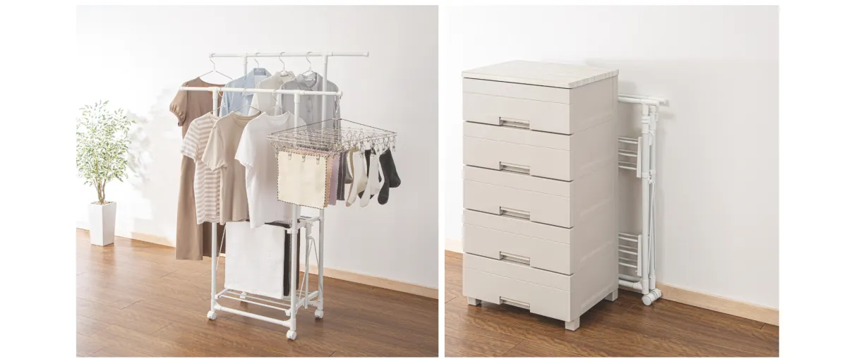 この物干しは、長い衣類を干す際に縦に、たくさんの洗濯物を干す時には横に拡張できるため、さまざまなシーンに対応します。また、使用しないときにはコンパクトに折りたたむことができるので、収納スペースを最大限に活用できます。このデザインは、都会の狭いマンションに住む方や、お子様のいる家庭、さらには単身赴任や学生の一人暮らしの方々にもぴったりです。