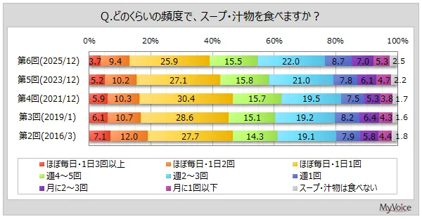最近の調査で、スープや汁物の消費傾向が明らかになりました。マイボイスコムが実施した調査によると、スープ・汁物を毎日食べる人は4割弱で、2021年以降に減少傾向にあります。一体、どのような背景があるのでしょうか。詳しく見ていきましょう。
