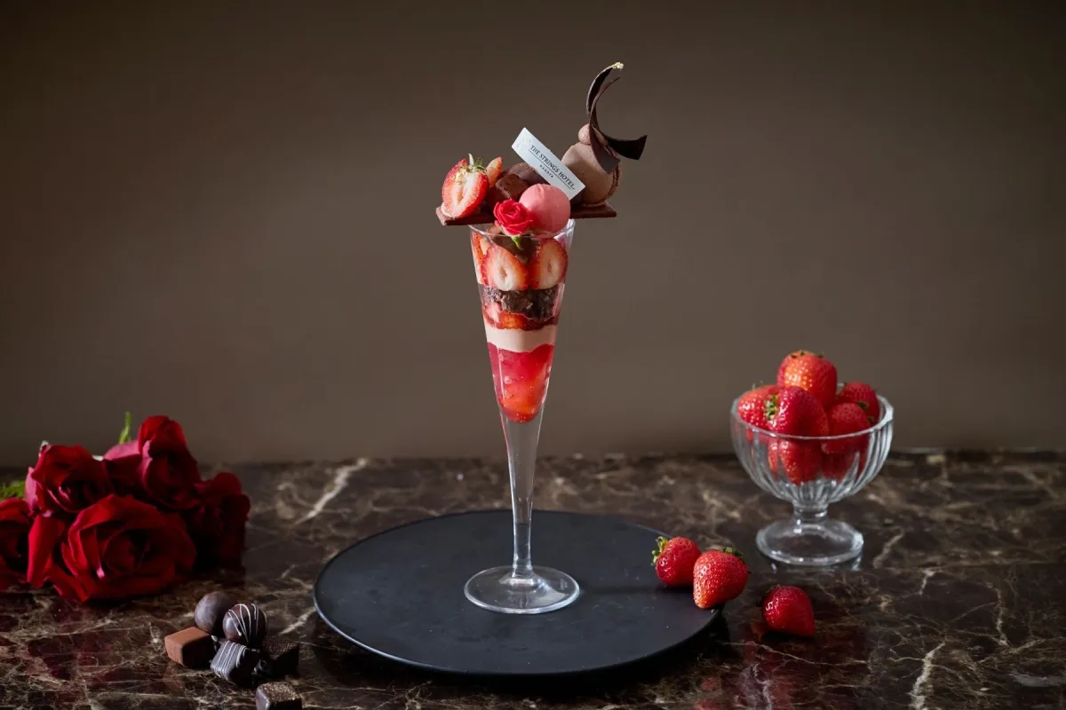 今回のパフェは、「大人のバレンタイン」をテーマにしています。旬の苺と濃厚なチョコレートを贅沢に使用したこのスイーツは、見た目も味わいもエレガント。上段には色鮮やかなチョコレートマカロンや生チョコレート、そしてラズベリーソルベなどが華やかに盛り付けられています。下段には新鮮な苺と甘酸っぱい苺のマリネが重ねられ、最後にはきらめくラズベリーシャンパンのジュレで爽やかに締めくくられています。