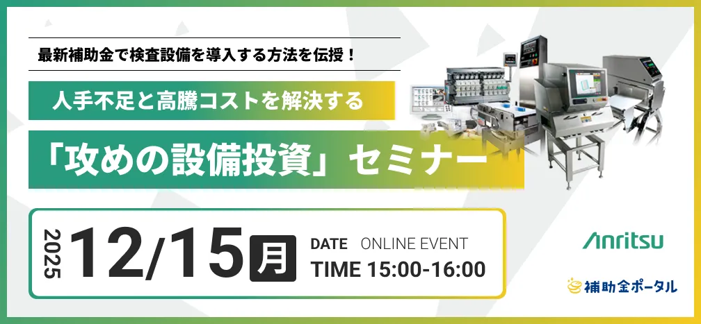 近年、製造業界では深刻な人手不足やコスト高騰が大きな問題となっており、効率的かつ品質の高い生産体制を構築するためには、検査設備の導入が欠かせません。そこで、株式会社補助金ポータルは、アンリツ株式会社と共催で「最新補助金で検査設備を導入する方法を伝授!」というオンラインセミナーを開催します。