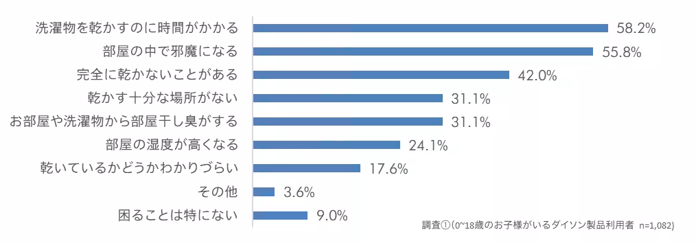 主要な悩みとして挙げられているのは、「乾かすのに時間がかかる」と「部屋で邪魔になる」こと、そして「ニオイの発生」です。58%の人が乾燥時間に不満を感じていると言います。