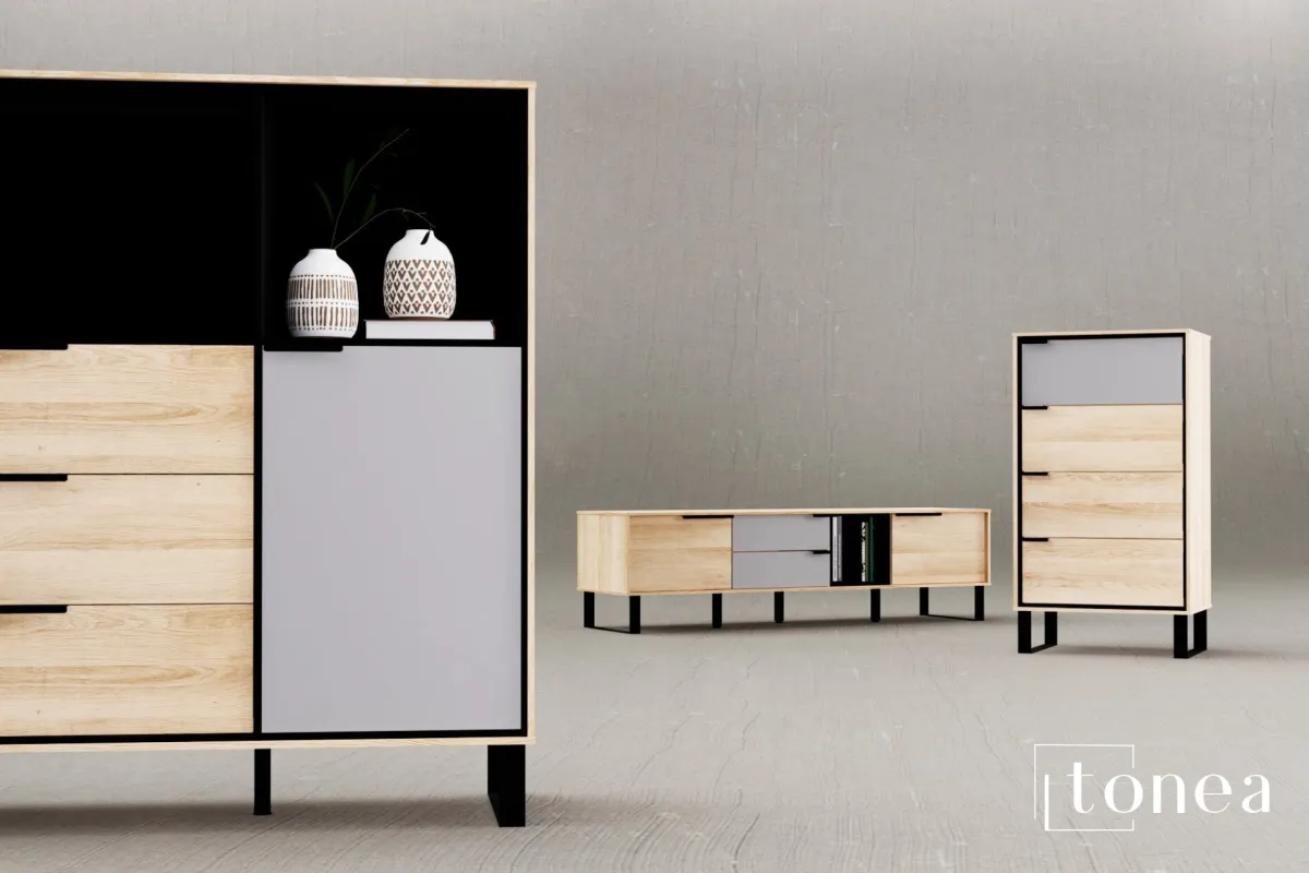 新しく登場したtoneaの家具は、柔らかなオーク木目とグレージュのアクセントパネル、さらにブラックのスチール脚が組み合わさった、控えめでありながらも品のあるトーンが特徴。ナチュラルな色合いとグレー系が見事に調和し、現代の住空間に柔らかく寄り添います。
