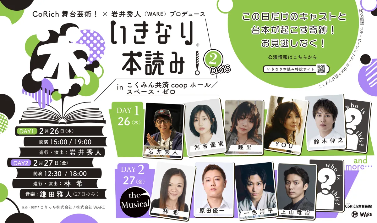 2026年2月26日(木)・27日(金)、新たな試みとして「いきなり本読み!2DAYS」が開催されます。演出家・岩井秀人と株式会社WAREのコラボによって生まれたこの企画は、その日限りのキャストが初見の台本を舞台で読み合わせることで、観客と一緒に「本読み」を楽しむという斬新なスタイルです。