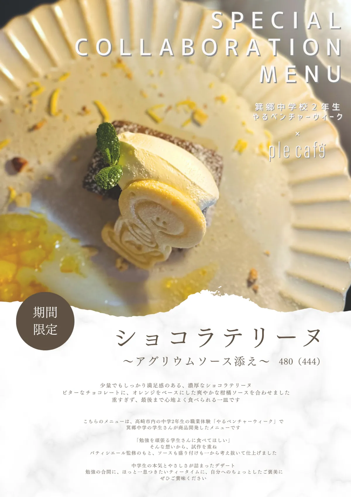職業体験に参加した中学2年生4名は、5日間にわたってカフェのメニュー開発を行いました。彼らは、来店データや過去の注文状況を分析し、ターゲットとなるペルソナを設定。最終的に選ばれたのは「高校3年生女子」で、友人とおしゃれな空間で勉強したい受験生を想定しました。この仮説に基づいて、「ショコラテリーヌ ~アグリウムソース添え~」が誕生しました。