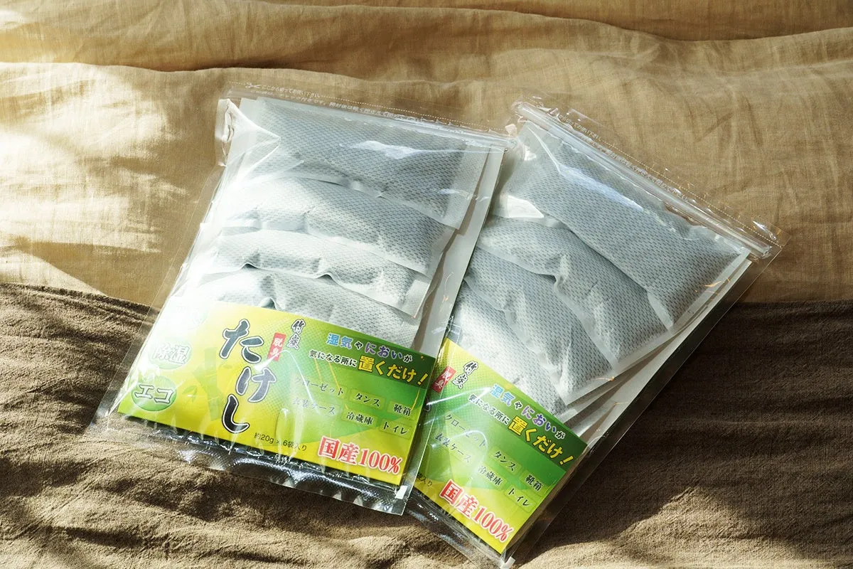「たけし」は、竹炭の特性を活かして臭気分子を物理的に吸着し、部屋の中を清潔に保ちます。特に、竹炭の多孔質構造は湿気をも吸収するため、衣類や食品を守る効果も期待できます。