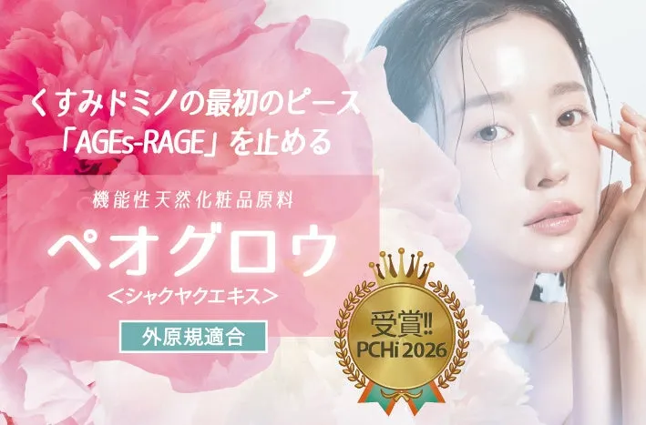 「ペオグロウ」とは、ボタン科のシャクヤクの根から抽出されるエキスで、抗菌、抗酸化、消臭、美白、抗糖化作用など、多様な効果を持っています。特に、肌の黄ぐすみや茶ぐすみを招くAGEs(最終糖化生成物)への影響を抑える作用があり、肌の見た目を改善することが期待されています。これにより、肌トーンを均一に整え、透明感のある美しい肌を実現するサポートができるとされています。