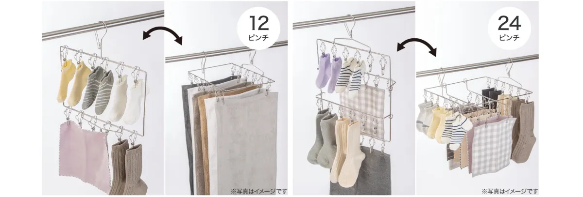 「縦でも横でも干せるステンレスハンガー」は、その名の通り、縦にも横にも使用できる独自の設計が特徴です。これにより、限られたスペースでも多くの小物が一度に干せるため、特に室内干しをする際に非常に便利です。靴下、ハンカチ、下着、タオルといった小物類を一度にまとめて干すことができ、家族の洗濯物が多いご家庭や単身世帯にも理想的な商品です。