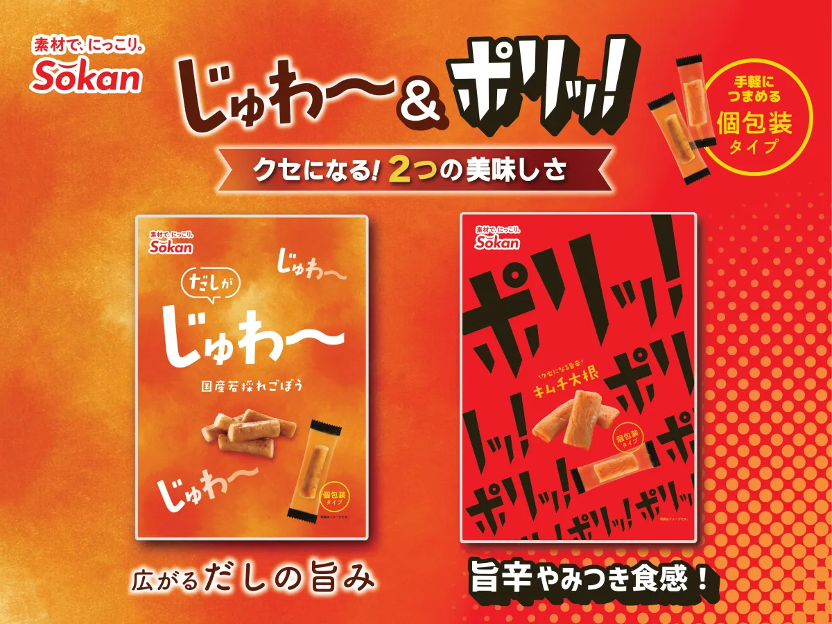 株式会社壮関から、待望の新商品が登場しました!3月23日より、全国のコンビニやスーパーマーケット、さらに壮関のオンラインショップで販売される『ポリッ!ポリッ!キムチ大根』と『だしがじゅわ~国産若採れごぼう』。今回の新シリーズは、食体験を“オノマトペ”で楽しむことをテーマにしています。噛んだ瞬間の音や味の広がりを視覚的に表現したパッケージが特徴で、珍味棚でも高い視認性を誇ります。