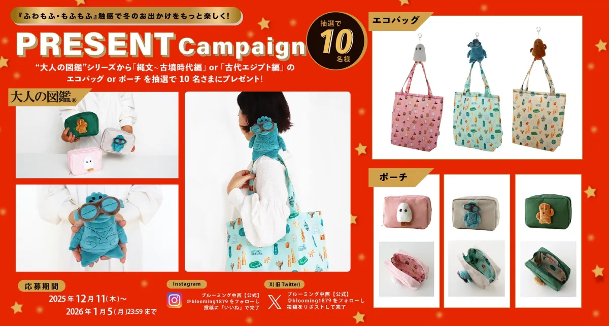 再販を記念して、SNSキャンペーンも開催されます。キャンペーン期間は2025年12月11日(木)から2026年1月5日(月)23:59まで。この期間中に応募すると、『大人の図鑑』シリーズから「踊る埴輪」、「遮光器土偶」、「メジェド」のエコバッグまたはポーチが、抽選で10名様にプレゼントされます。
