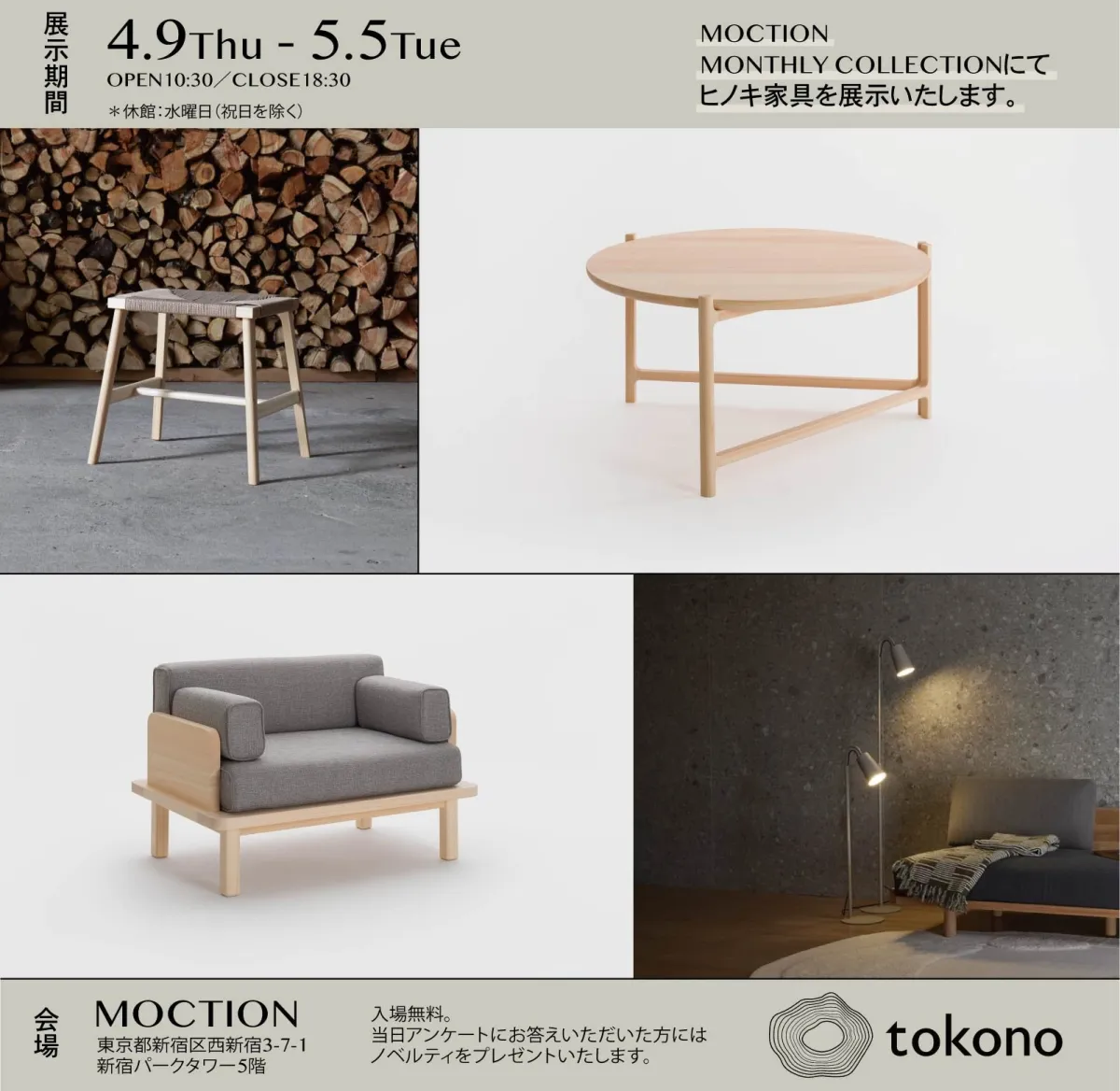 MOCTIONにて「国産ヒノキの家具を使った空間提案」というテーマで魅力的な展示会を行います。このイベントでは、ヒノキの持つ独特の香りや肌触り、経年変化を実際に体験することができます。