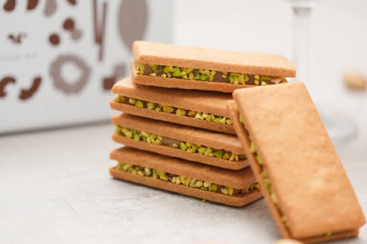 この新たな焼き菓子は、バターの風味が豊かなクッキーで、塩が効いたキャラメルヌガーをサンドして仕上げています。口に含むと、噛むごとにキャラメルの濃厚なコクが広がり、ナッツの香ばしさが重なる一方、後味は軽やかでスッキリとしています。この独特なバランスが魅力で、甘さと塩味のハーモニーが最高の一品です。