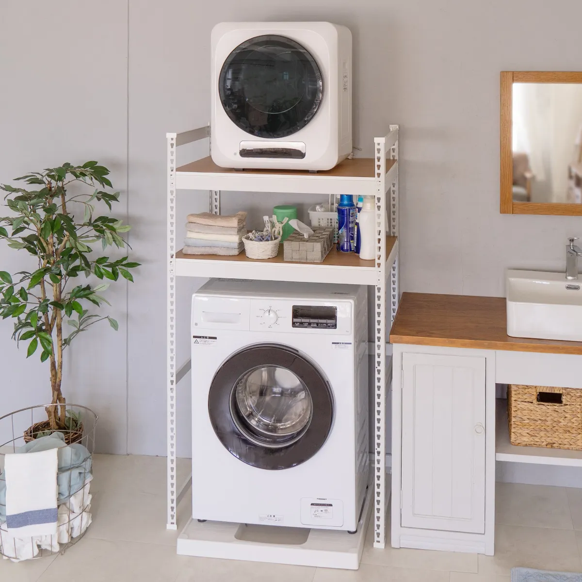 このランドリーラックの最大の魅力は、そのシンプルな構造と簡単な組み立て方法です。わずか8本のボルトさえあれば、工具を持っていなくても短時間でセッティングが可能。忙しい朝でも手間をかけずに設置できる点が嬉しいですね。耐荷重は60kgまで対応。これなら小型乾燥機の他にも、洗剤やタオルなども一緒に収納できるので、空間を有効利用できます。